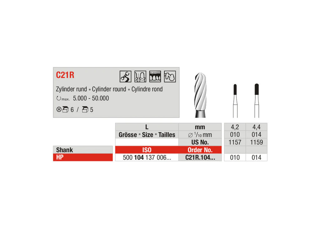 TUNGSTEN CARBIDE BUR HP C21R PLAIN CUT ROUND END CYLINDER EDENTA